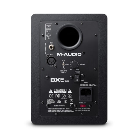 With M-Audio’s BX5-D3, every detail has been meticulously engineered with one goal in mind – to facilitate the freedom to mix with confidence. BX5-D3 monitors have a rear- mounted bass port, meticulously engineered to the exact length and diameter. The result? Deep, defined bass response with maximum bass extension and resolution. When combined with a smoothly-flared port, BX5-D3 monitors markedly reduce the audibly-intrusive air turbulence that results when bass is played back at high sound pressure levels (SPLs). BX5-D3’s tweeter is mounted in a custom waveguide for reliably accurate dispersion that eliminates unwanted high-frequency “scatter,” whilst ensuring a soundstage that remains consistently wide and stable. For seamless setup and easy-location of the optimum listening position, the BX5-D3’s front-mounted positioning LED shines brightly when you’re located in the perfect listening spot, for uncompromisingly accurate and reliable critical evaluations. Finally, BX5-D3’s iconic design on the front panel—M-Audio’s famous “keyhole” shape—is more than just an attractive look: This special “fastenerless” design ensures so there are no driver attachment screw heads to interfere with the sound coming from our drivers.